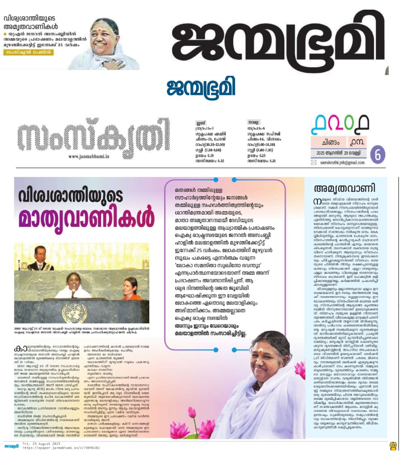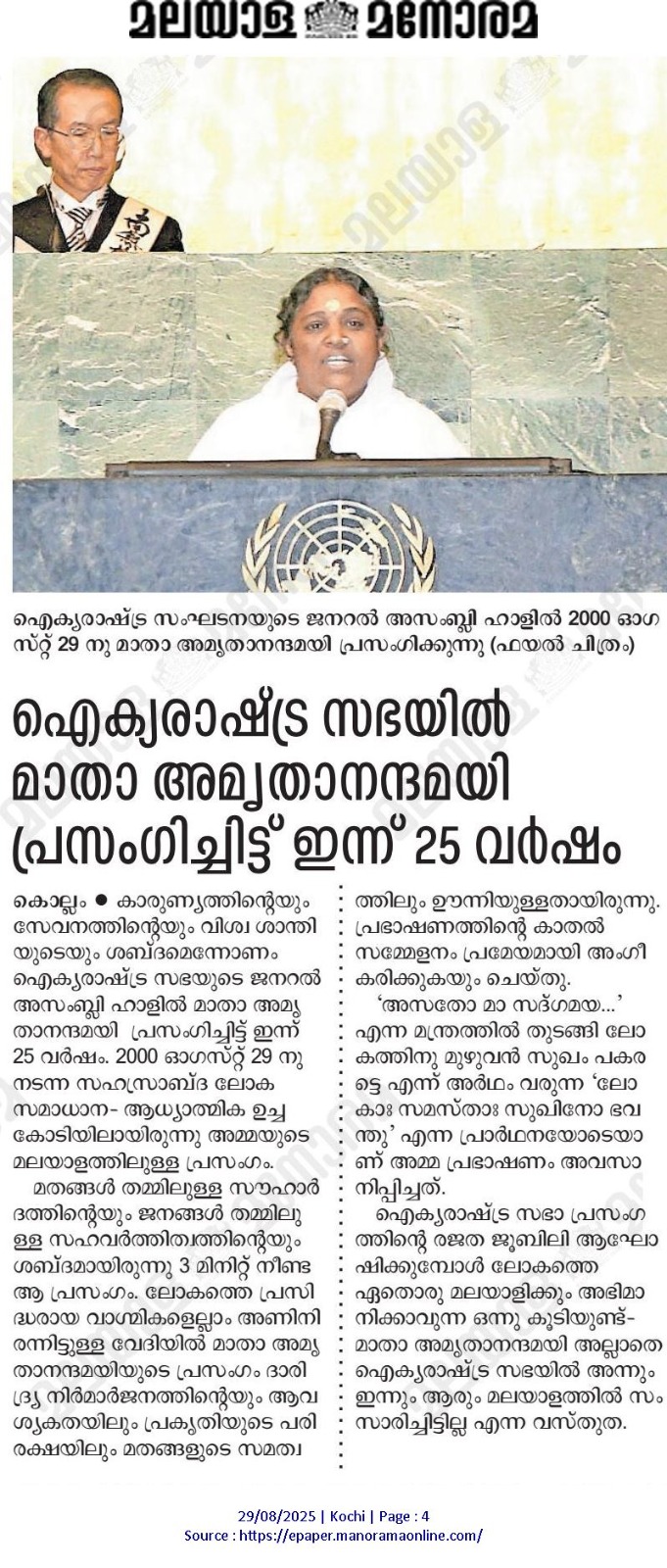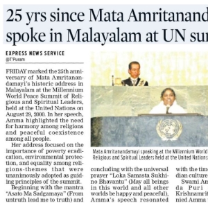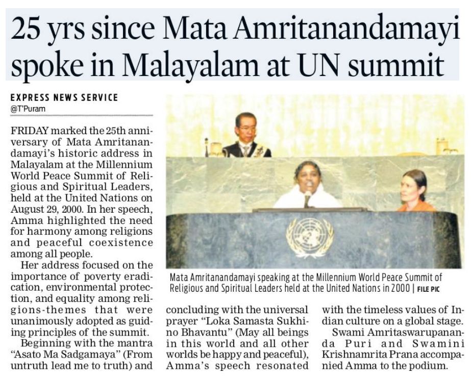അമ്മയുടെ യുഎൻ പ്രസംഗം, കരുണ–ഐക്യം–സേവനം തുടങ്ങിയ മൂല്യങ്ങൾ, 2000–2026 ലോകമാറ്റങ്ങൾ, ആത്മീയ നേതാക്കളും സാമൂഹ്യ-പരിസ്ഥിതി പ്രവർത്തകരും.